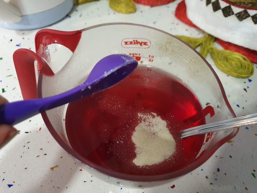 Empezar mezclando 5g grenetina con agua caliente. (Start mixing 5g gelatin in hot water)